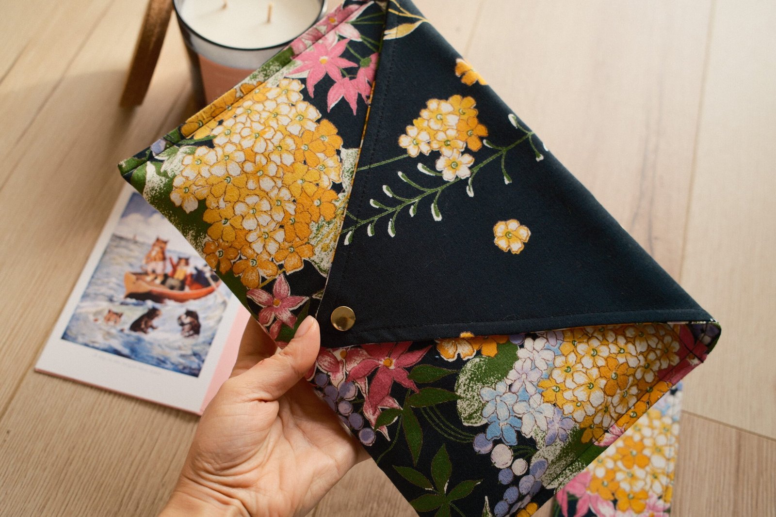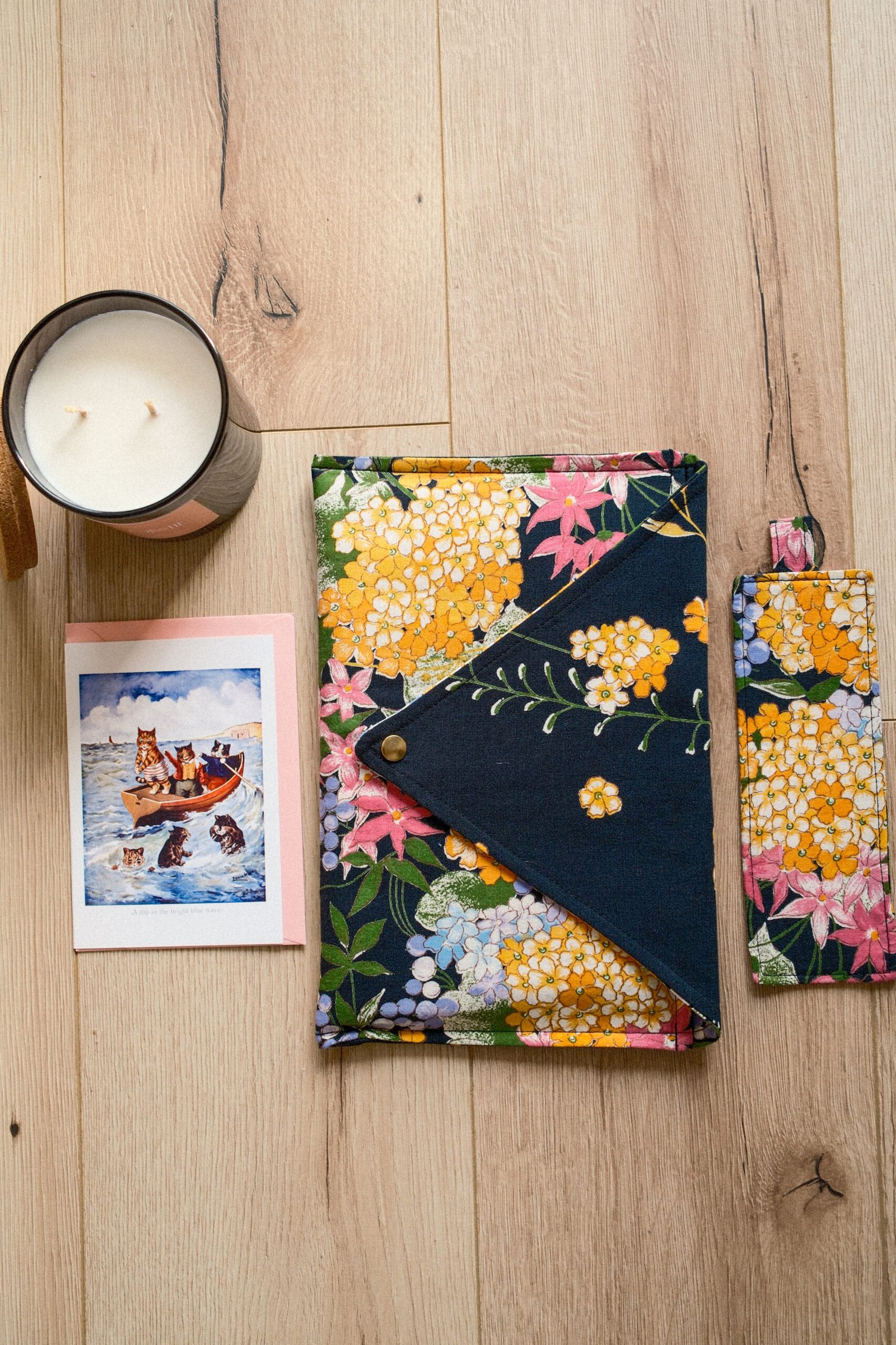 Setul conține: husă și semn de carte din materiale upcycled, lumănare pafrumată din ceara de soia în recipient upcycled și o carte + felicitare CADOU